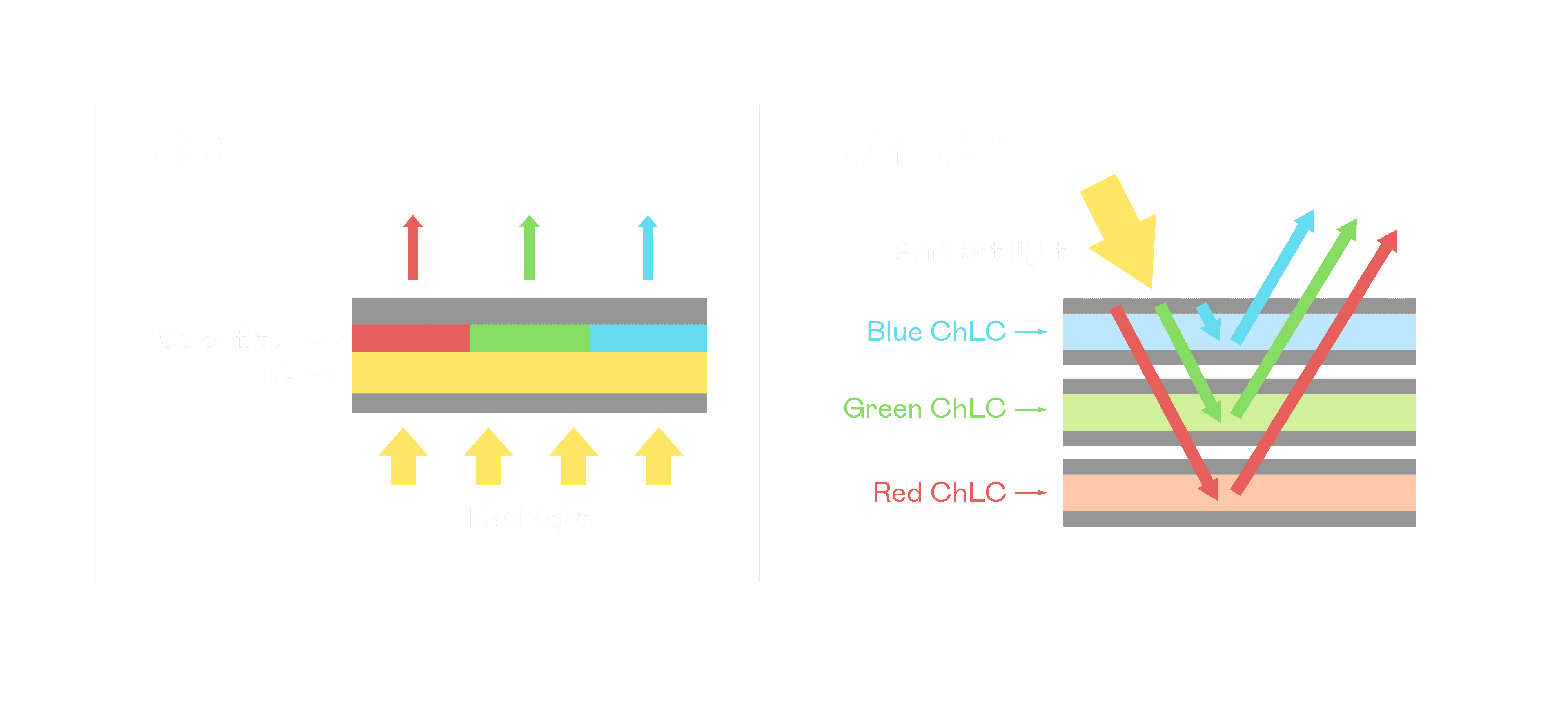 ChLCD 胆固醇液晶就如同纸张一样,,,,透过反射环境光来显示影像,,,,因此长时间观看不易造成人眼视觉疲劳,,,,可达到护眼效果。。当处于户外阳光下使用,,,,LCD 影像容易失真而不易观看,,但胆固醇液晶仍可维持较佳的影像品质。。。。