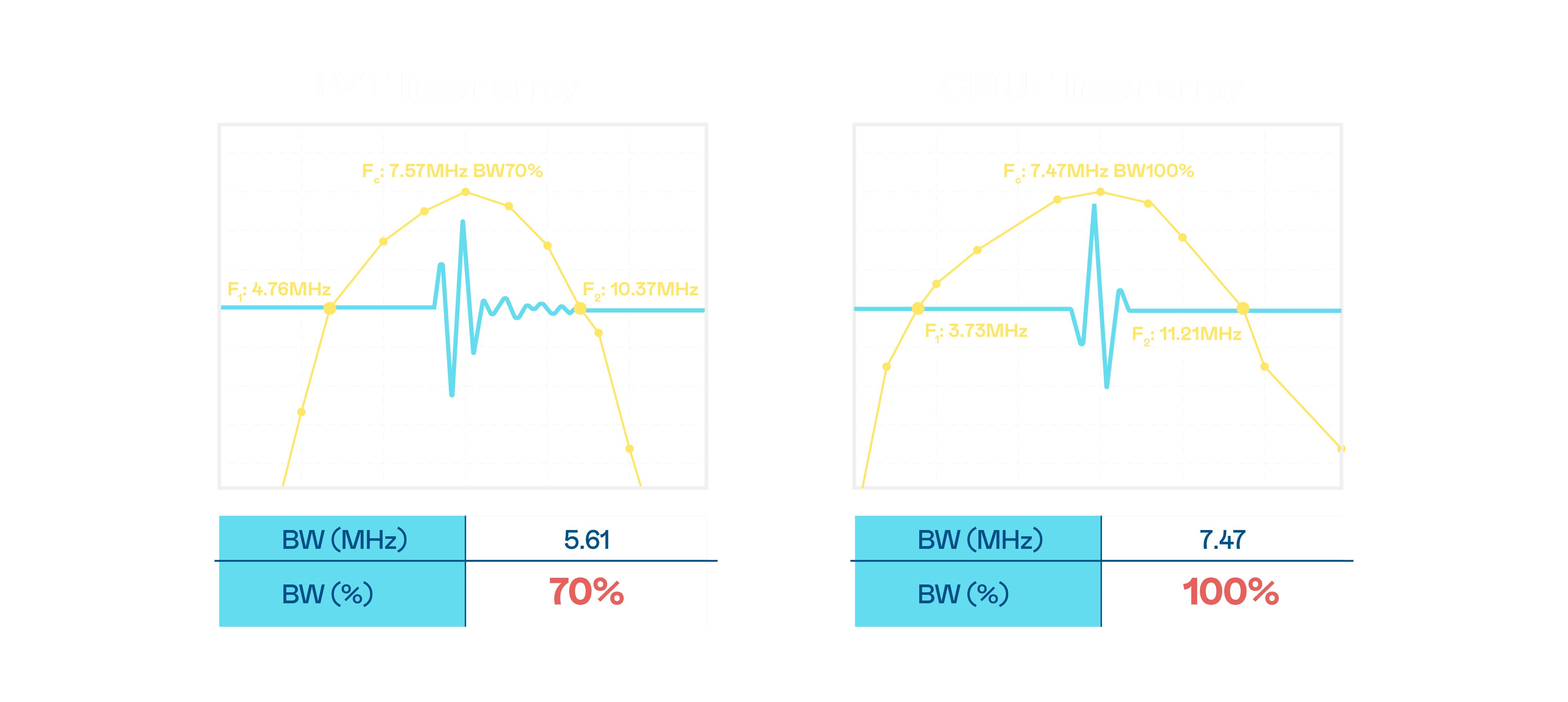 超音波影像的解析度高低,,,首先取决于探头能发出的讯号频宽。。。。人生就是博 CMUT 可提供高清晰的超音波讯号,,,提供高频宽、、、、高灵敏度、、、、影像纹理细节更高的超音波影像,,协助医护人员缩短影像判读时间及利用精准的医疗影像进行诊断。。